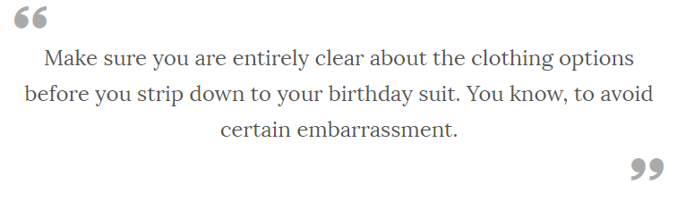 There is always the possibility that the hot tub party comes with an invitation with a clothing optional disclaimer. If this is the case, by all means, leave your suit at home. However, make sure you are entirely clear about the clothing options before you strip down to your birthday suit. You know, to avoid certain embarrassment. After all, you wouldn’t want to embarrass the other partygoers.