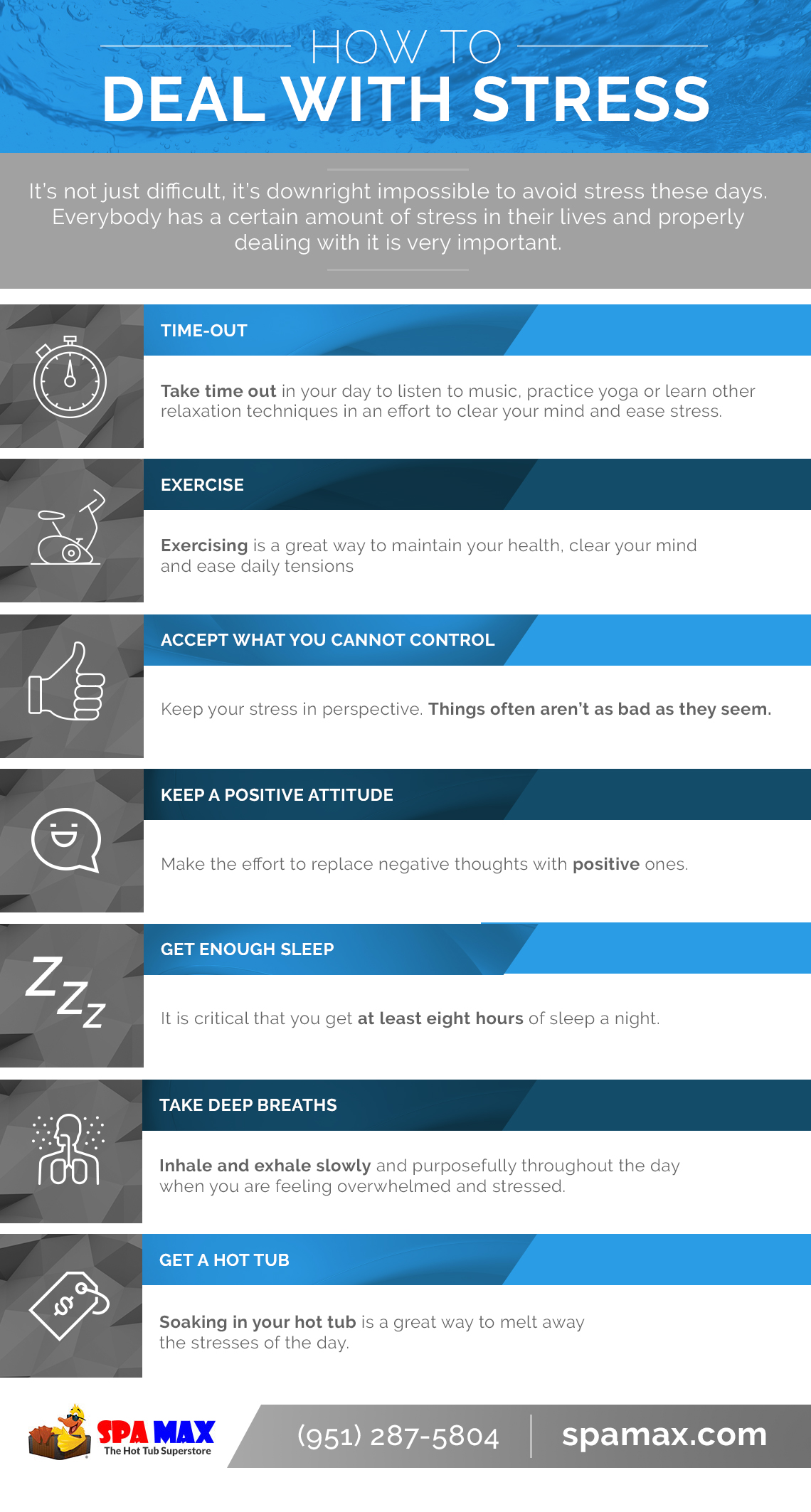 Everyone deals with stress. Everything from family problems to work to financial difficulties can trigger stress. It’s a way to cope with the situation. But chronic stress will take a toll on your health and well-being, which is why it is so important that you deal with stress. Exercise is a great way to lower your stress levels. And it does your body good to sit in a relaxing hot tub after a tough day at work.